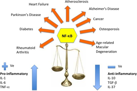 Cytokine dysregulation and NF-κB inflammation pathway. This reshaping of cytokine expression pattern with a progressive tendency toward a pro-inflammatory phenotype has been called “inflamm-aging” and is found associated with age-related diseases. Several molecular pathways have been identified that trigger the inflammasome and stimulate the NF-κB and the IL-1β-mediated inflammatory cascade of cytokines.