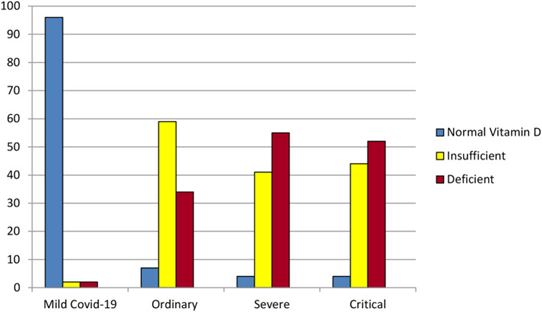 Some of the results of the retrospective chart review by Alipio et al. (3). Of the 212 hospitalized COVID-19 patients, 96% of those with mild COVID-19 had normal vitamin D levels (above 30 ng/ml). In contrast, over 50% of the patients with severe or critical COVID-19 were vitamin D deficient (level 20 ng/ml or lower).