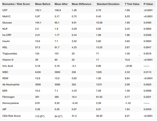 Results indicate significant success in reducing chronic disease risk in this 70-person cohort, reflected in improvements in “before” and “after” biomarker values: