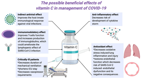 Source: Abobaker, Anis et al. “Overview of the possible role of vitamin C in management of COVID-19.” Pharmacological reports : PR vol. 72,6 (2020): 1517-1528. doi:10.1007/s43440-020-00176-1 This article is made available via the PMC Open Access Subset for unrestricted research re-use and secondary analysis in any form or by any means with acknowledgement of the original source. These permissions are granted for the duration of the World Health Organization (WHO) declaration of COVID-19 as a global pandemic.