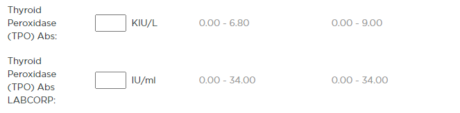 For instance, Vibrant America uses a reference range of <34 IU/ml for their Anti-TPO biomarker result, which is the same as Labcorp, so enter the result in the LabCorp Anti-TPO biomarker slot.