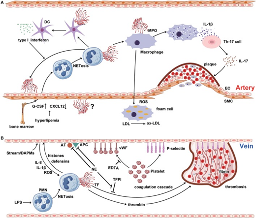 - Neutrophil extracellular traps (NETs) are involved in the whole process of atherosclerosis. The myeloperoxidase from NTEs can stimulate macrophage to oxidize low-density lipoprotein (LDL) to ox-LDL and form the foam cell. The hyperlipidemia recruits neutrophil into circulation from bone marrow by upregulating the expression of granulocyte colony-stimulating factor and downregulating the level of C-X-C motif ligand -12, which is an important signal for the clearance and recruitment of aged neutrophils to the bone marrow.